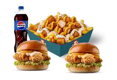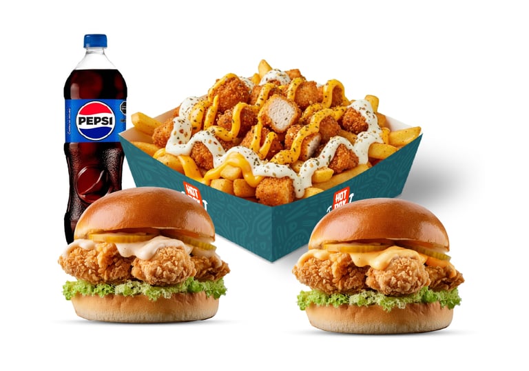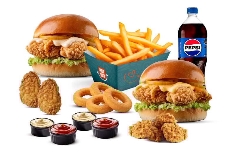 1 Hotbox Burger + 1 Tornado Burger + Patates Kızartması + 2 Kanat + 4 Bites + 4 Soğan Halkası + 1LT İçecek + 2 Ketçap + 2 Mayonez