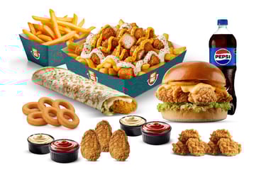 1 Tornado Box + 1 Tornado Burger + 1 Tornado Wrap + Patates Kızartması + 3 Kanat + 6 Bites + 6 Soğan Halkası + 1LT İçecek + 2 Ketçap + 2 Mayonez