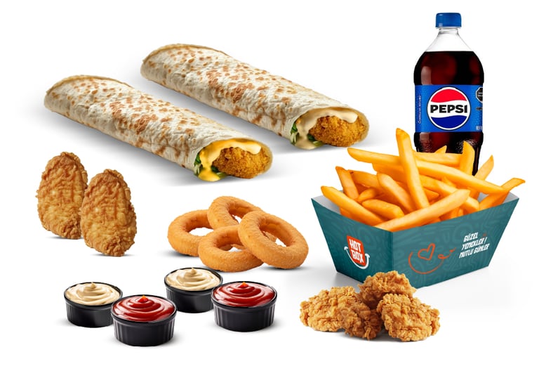 1 Hotbox Wrap + 1 Tornado Wrap + Patates Kızartması + 2 Kanat + 4 Bites + 4 Soğan Halkası + 1LT İçecek + 2 Ketçap + 2 Mayonez