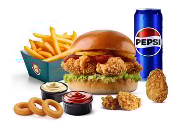 Tornado Burger + Patates Kızartması + 1 Kanat + 2 Bites + 3 Soğan Halkası + İçecek + Ketçap + Mayonez