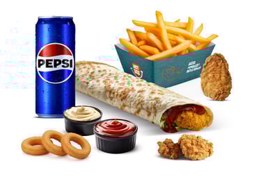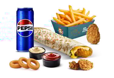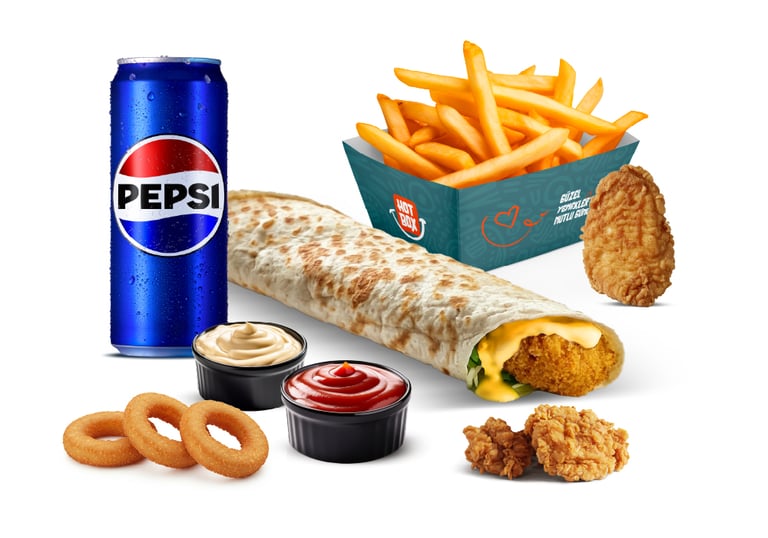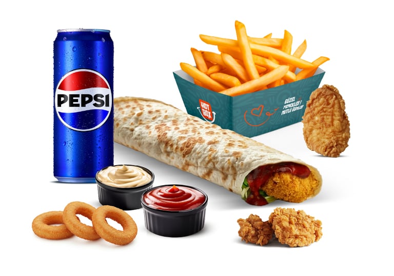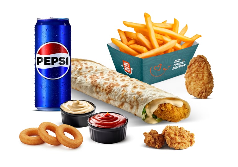 Hotbox Wrap + Patates Kızartması + 1 Kanat + 2 Bites + 3 Soğan Halkası + İçecek + Ketçap + Mayonez