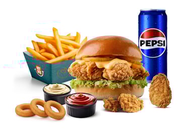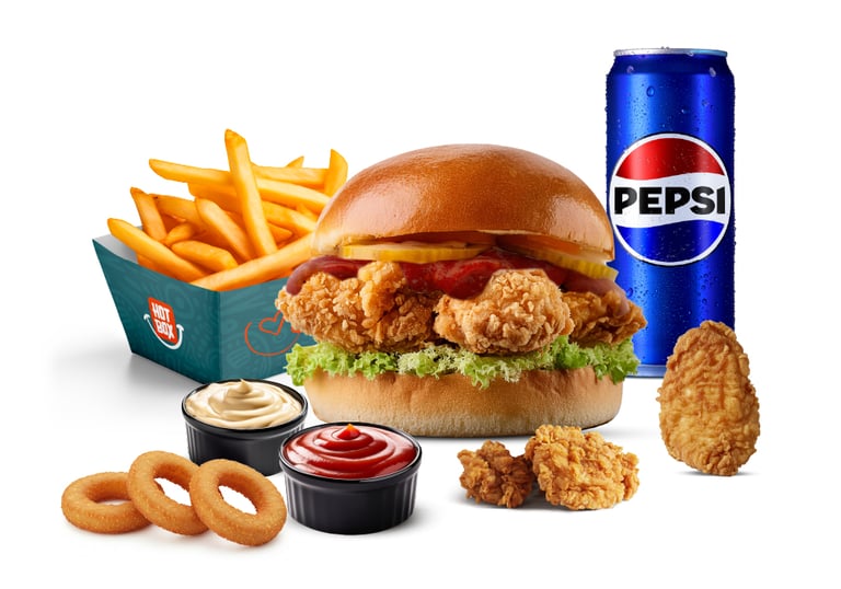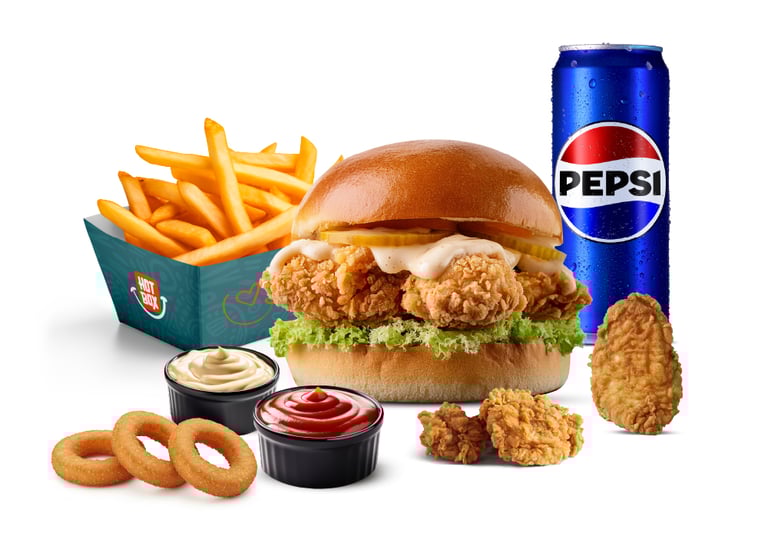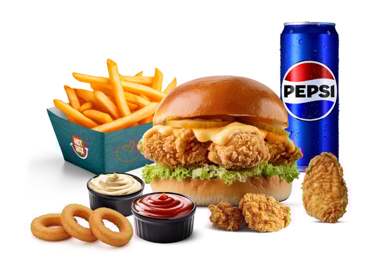 Hotbox Burger + Patates Kızarması + 1 Kanat + 2 Bites + 3 Soğan Halkası + İçecek + Ketçap + Mayonez