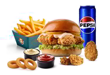 Dragon Burger + Patates Kızartması + 1 Kanat + 2 Bites + 3 Soğan Halkası +İçecek + Ketçap + Mayonez